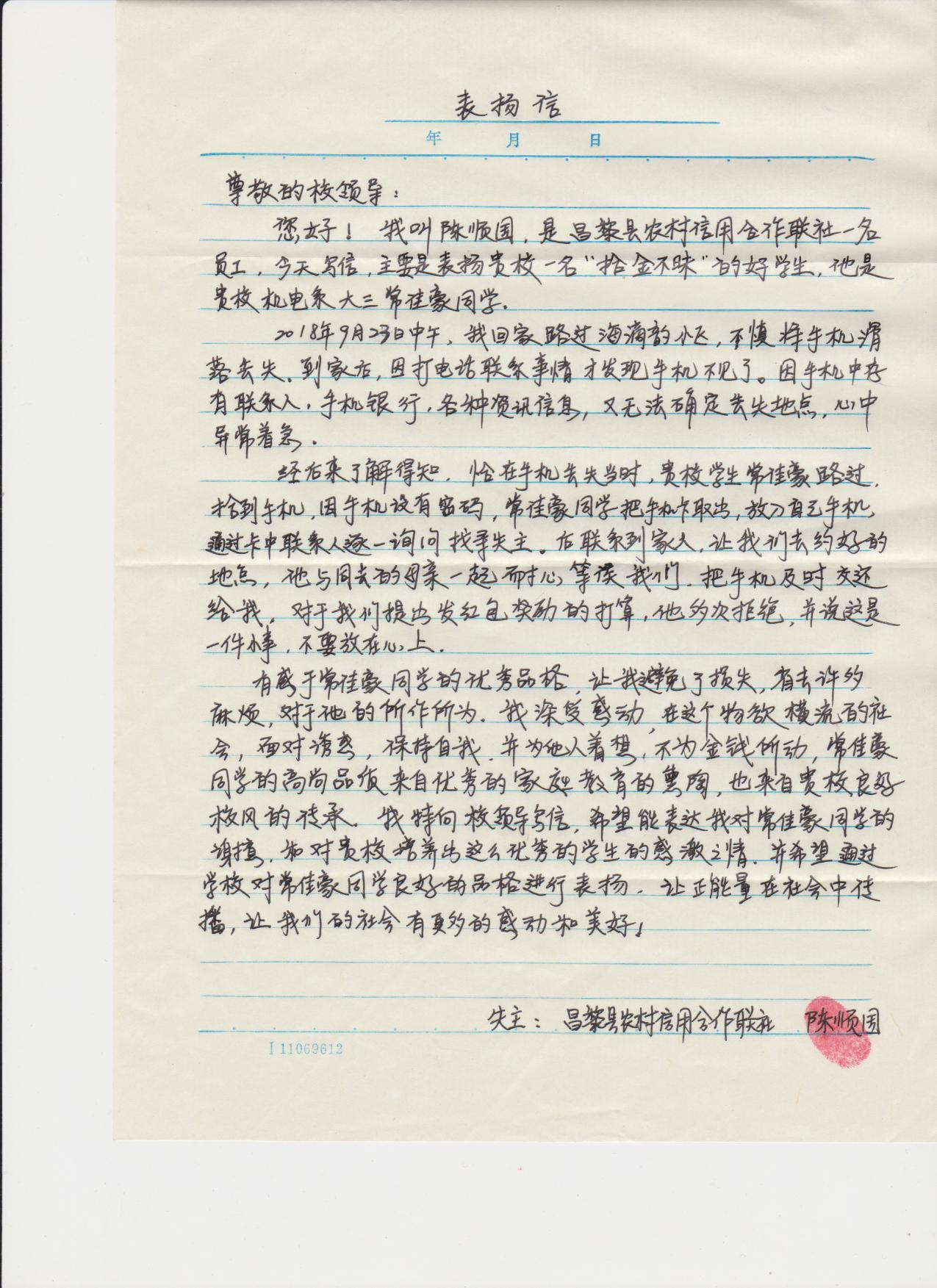 2018年9月26日,伟德BV官网收到昌黎县农村信用合作联社员工送来的表扬信,对伟德BV官网16级机制专业常佳豪同学帮助找寻手机,坚决不收红包的行为表示感谢,对公司良好校风表示赞扬。昌黎县农村信用合作联社员工因丢失手机异常着急,常佳豪同学路过并拾到手机,与失主家人取得联系,第一时间将手机归还,并多次拒绝失主的红包奖励,最后在失主的一再追问下才告知了公司名字和自己的姓名。失主随即来到伟德BV官网,将感谢信送到该院领导手中,这时大家才知道该院员工拾金不昧暖人心的感人事迹。
