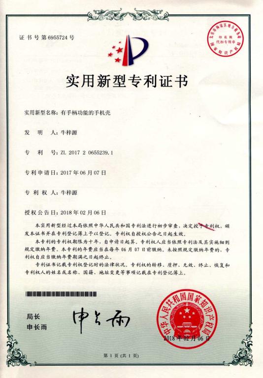 近日,从国家知识产权局获悉,2014级机械设计制造及其自动化专业牛梓源同学设计发明的《有手柄功能的手机壳》获批国家实用新型专利证书(专利号:ZL201720655239.1)。