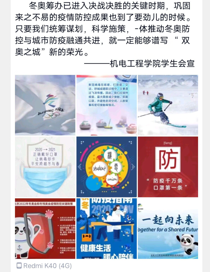 宣传活动分为线上和线下同时进行。线下通过摆展板的方式进行,积极宣传冬奥会,让同学们了解冬奥会的重要性;线上组织全体员工参加“冬奥会防疫”海报征集活动并进行评选宣传,发布“2022冬奥在即·运动需防疫”说说,同学们通过qq、微信等媒体方式转发说说,宣传冬奥会、注重校园防疫。